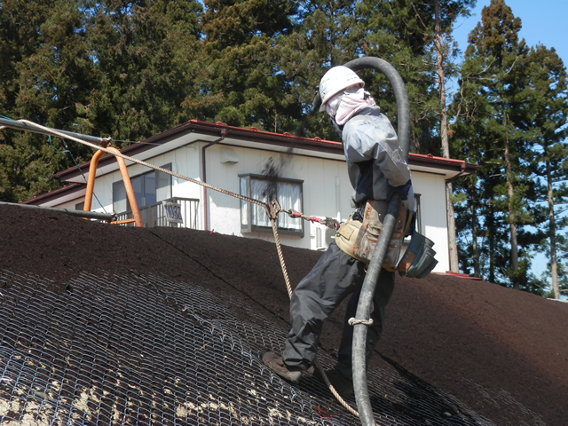 法面にモルタルや植生基材を吹付、表層の崩壊や浸食を防ぐ工法です。